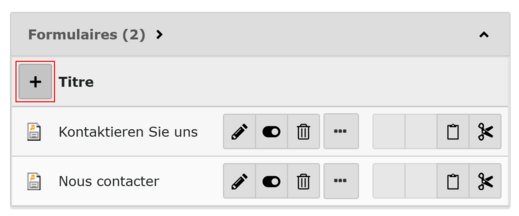 Pour créer un nouveau formulaire, il vous faut parcourir les enregistrements de la fenêtre de contenu jusqu'à arriver à un bloc Formulaires. Dans ce bloc, cliquez sur le bouton + à côté de Titre pour créer votre formulaire :