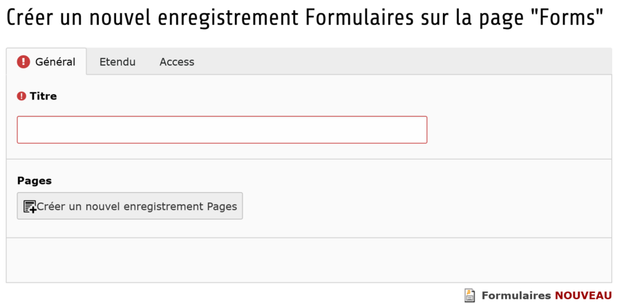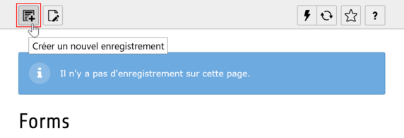 Si aucun formulaire n'existe pour l'instant, vous devrez créer tout d'abord un nouvel enregistrement au sein du répertoire Forms. Pour ce faire, cliquez sur le bouton de création d'enregistrement dans le menu du contenu :