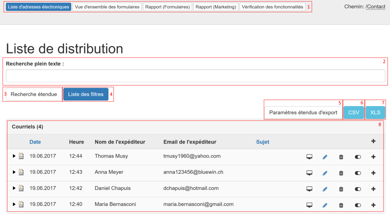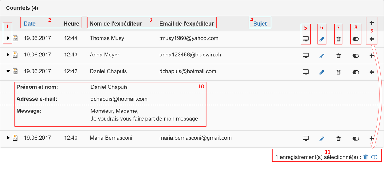 - La liste des enregistrements reçus par formulaire. Ces enregistrements sont appelés courriels car il est supposé que pour chaque formulaire l'adresse e-mail de l'expéditeur est demandée. C'est dans cette zone que vous pouvez gérer vos données reçues.