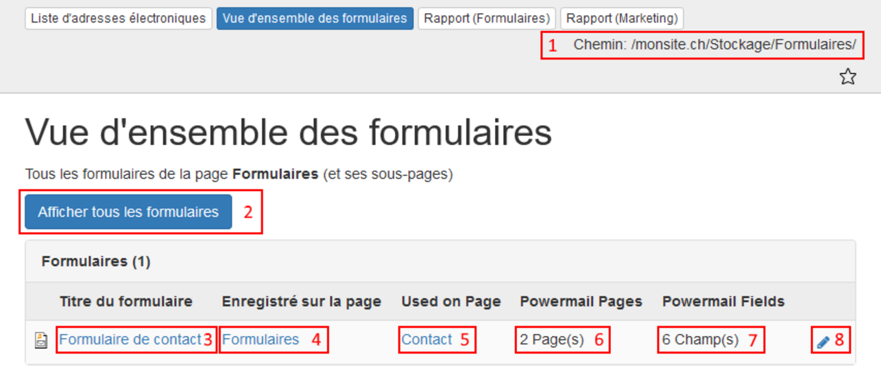 La vue d'ensemble vous permet de voir les formulaires stockés dans la page sélectionnée. La fenêtre se présente comme suit :