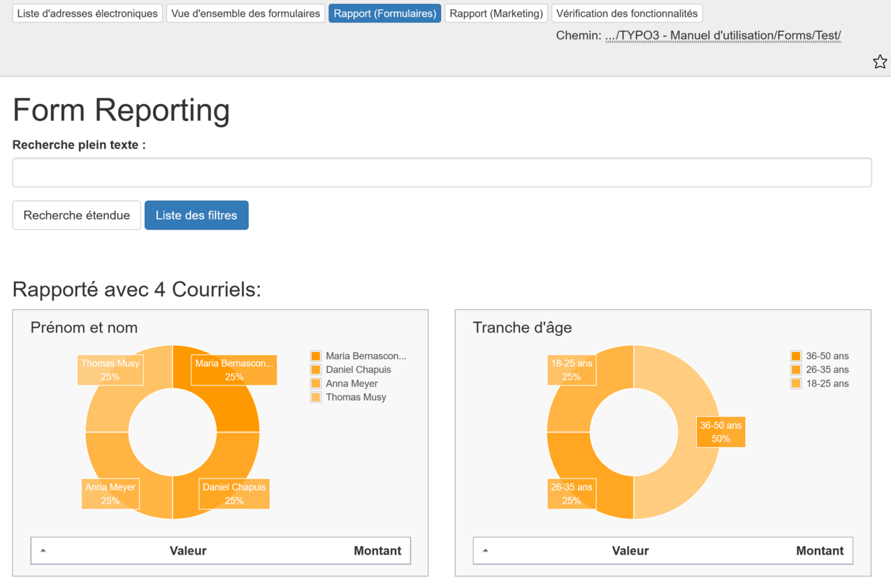 Cette section vous fournit des statistiques des enregistrements courriels reçus, et ce, pour chaque champ du formulaire. En voici un aperçu :