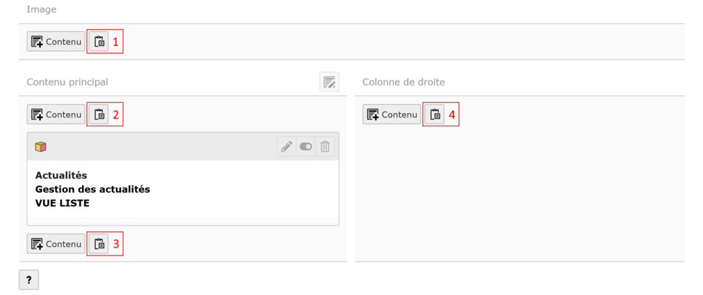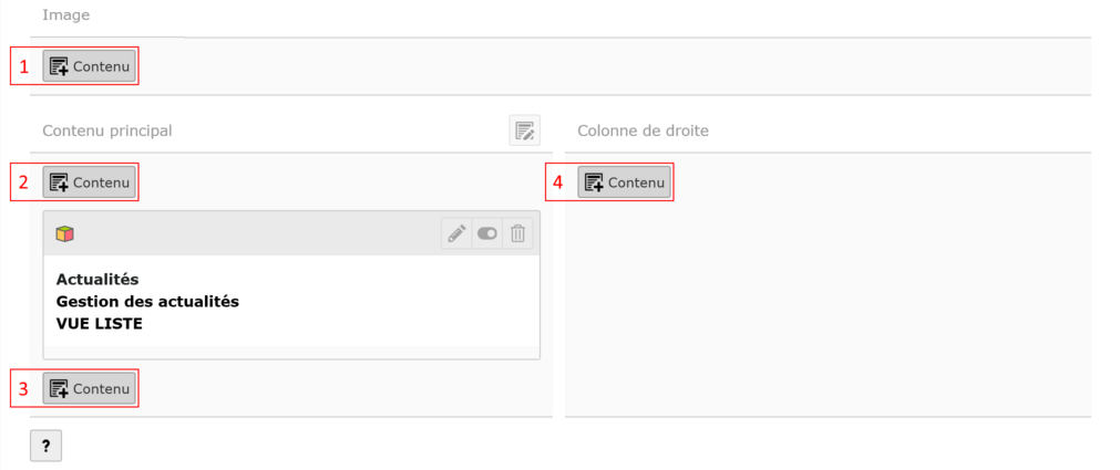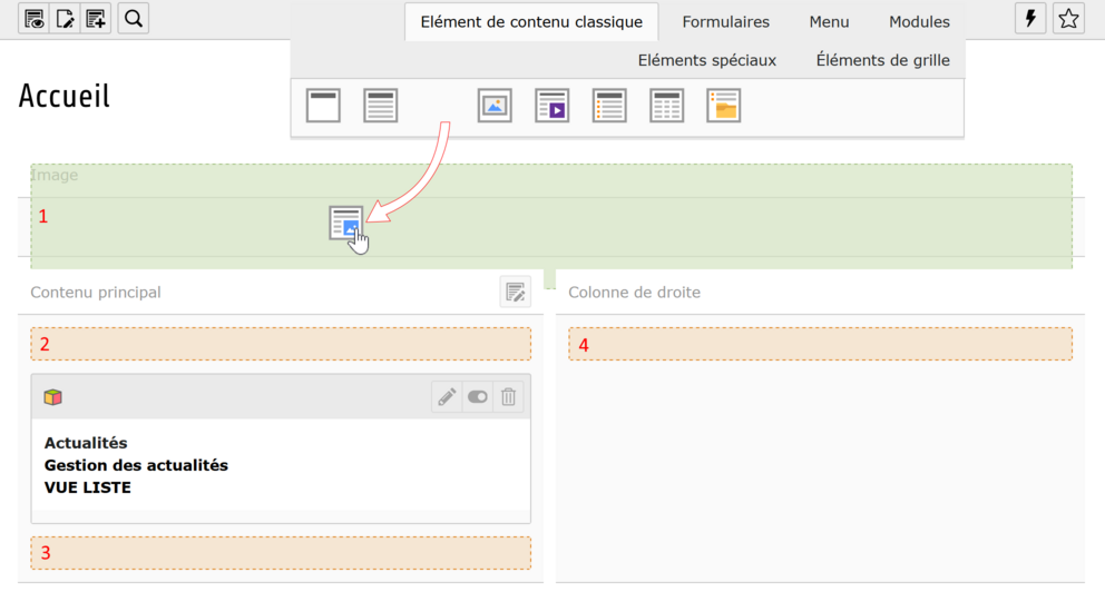 - Créer l’élément dans la zone Contenu principal placé avant l’élément Actualités.
