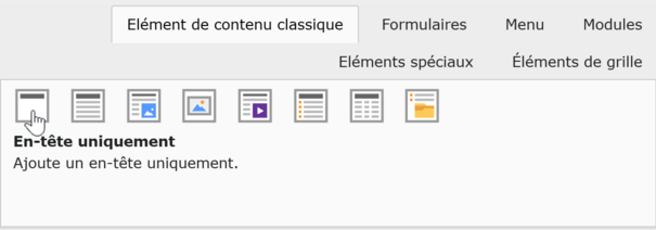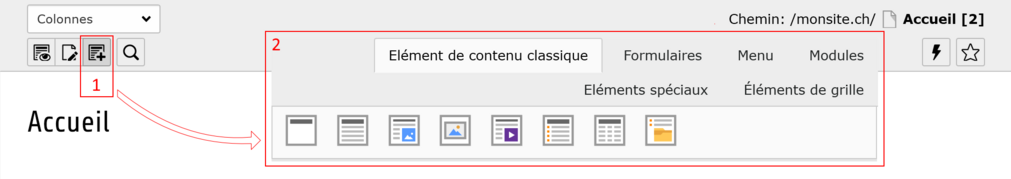Un élément de contenu, aussi appelé bloc de contenu, est le constituant de base pour une page. Un tel élément permet d’insérer ce qui sera affiché dans une page, comme une image, un texte ou une structure plus complexe comme un formulaire à remplir. En créant ces éléments, en les remplissant et en les ordonnant à votre guise, vous indiquerez à votre page quel contenu afficher.