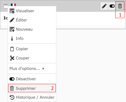 - Cliquez sur le bouton de suppression dans le menu du contenu situé au dessus de la fenêtre d'édition de l'élément de contenu.