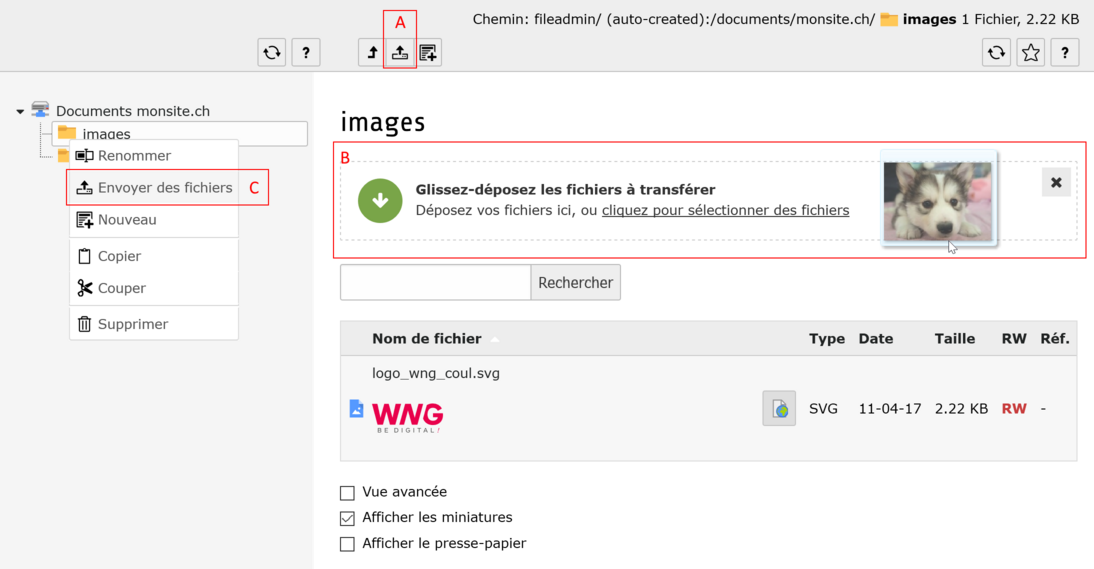 ? Assurez-vous d’avoir sélectionné le bon répertoire avant d’envoyer votre fichier. Dans l’exemple ci-dessus, le répertoire sélectionné est images. - Sélectionnez un ou plusieurs fichiers se trouvant sur votre ordinateur. Faites glisser votre sélection jusqu’à la liste de fichiers de TYPO3. Lorsque vous survolez la bonne zone, la flèche à gauche du texte Glissez-déposez les fichiers à transférer devient verte et c’est signe que vous pouvez relâcher le bouton de la souris pour effectuer l’envoi.