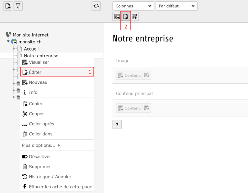 - Sélectionnez la page et cliquez sur le bouton d’édition dans le menu du contenu.