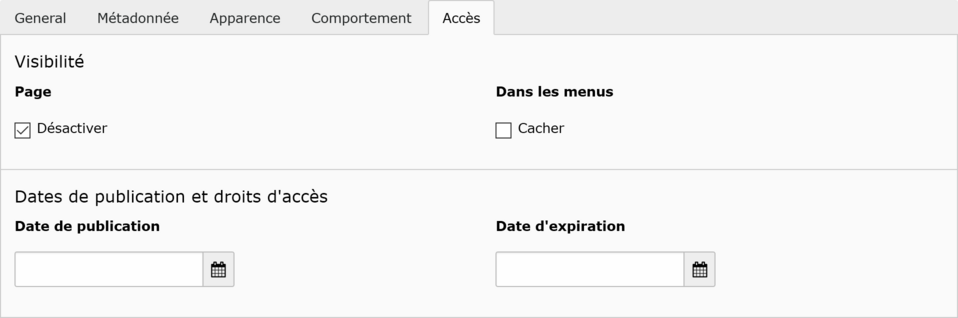 On retrouve l’onglet Accès dans plusieurs éléments dans TYPO3, aussi bien dans les pages que dans les éléments de contenu. Il regroupe des paramètres très utiles pour la publication :