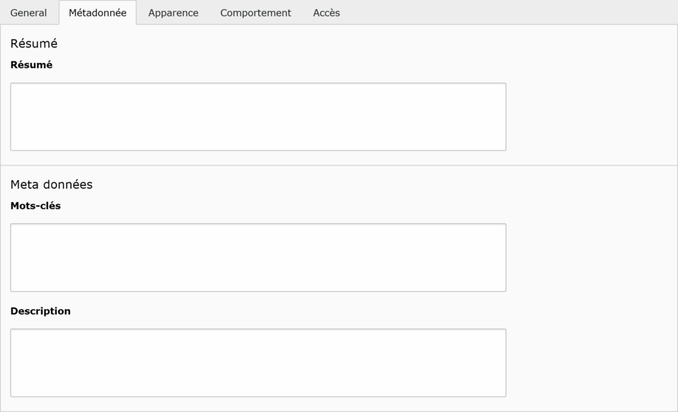 Vous arrivez alors dans la fenêtre d’édition des paramètres de la page. Pour cette fenêtre, le menu du contenu se présente ainsi :