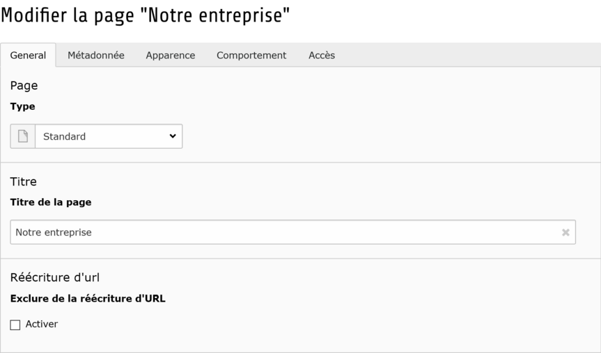 Titre de la page : cela correspond au nom de la page. Ce nom est affiché dans l’arborescence des pages en backend. En frontend, vous retrouvez ce nom dans le menu qui contient la page et dans le titre affiché.