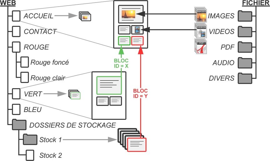 - deux arborescences sont disponibles, WEB (les pages) et FICHIER (les médias) ;