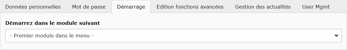 L'onglet Démarrage vous permet de choisir quel est le module de TYPO3 qui va s'ouvrir par défaut lorsque vous vous connectez à l'administration. Il se présente comme suit :