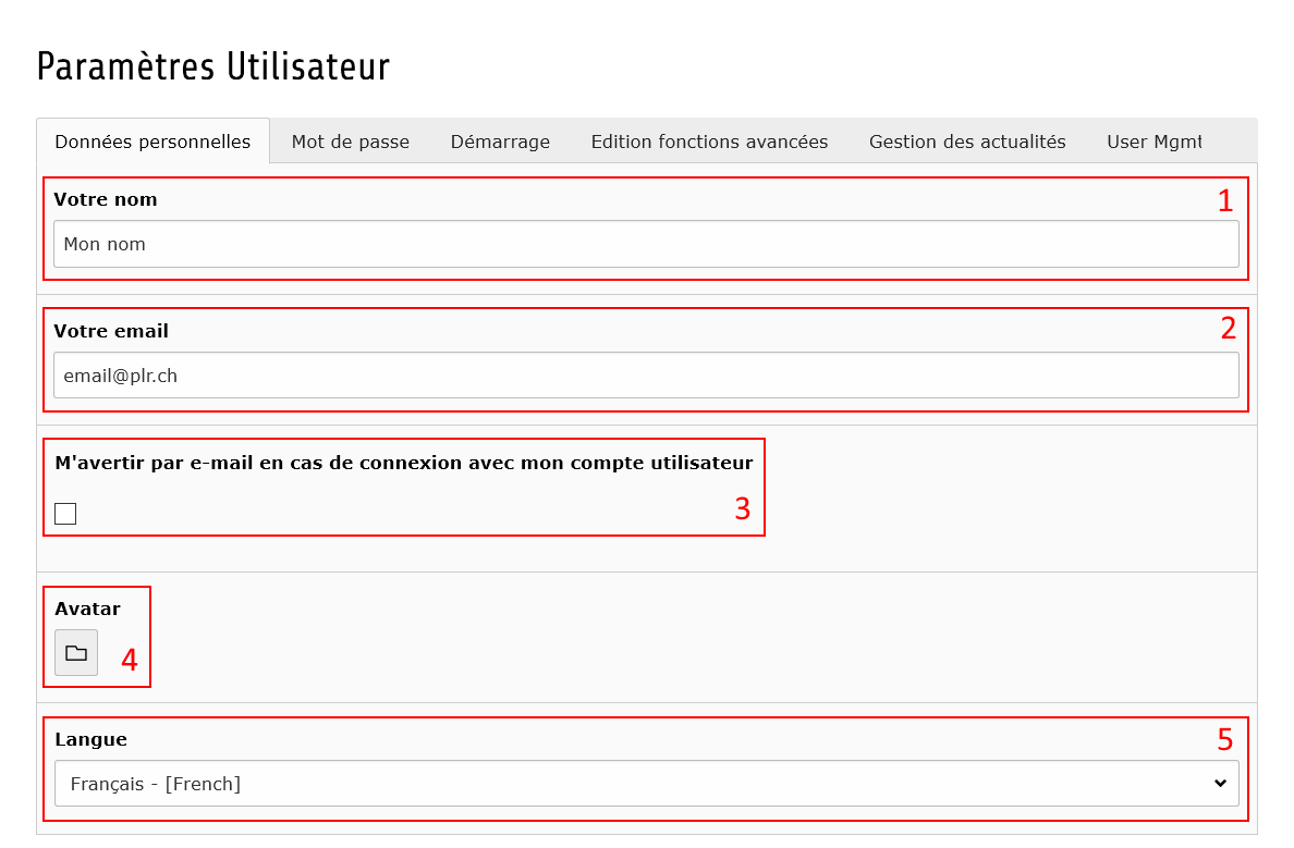 ? Pour travailler dans de bonnes conditions, il est important de sélectionner le français dans les paramètres présents dans les onglets Données personnelles, Gestion des actualités et User Mgmt.