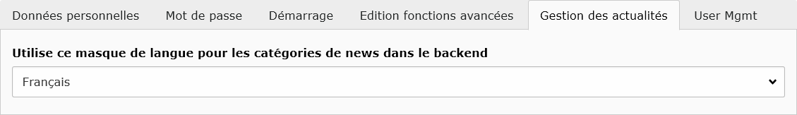 Il est important de choisir ici la langue voulue pour l'affichage des catégories des actualités. Ce choix s'applique sur l'interface d'administration et n'a pas d'incidence sur l'affichage du site pour les internautes.