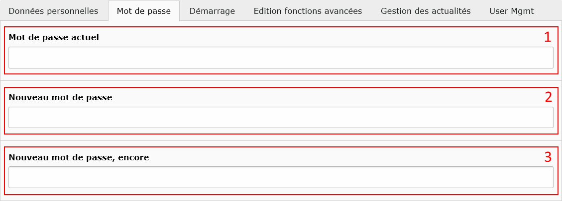 Les champs présents dans cet onglet ne sont à remplir que si l'on désire changer son mot de passe, autrement ils doivent rester vides. Voici les paramètres à saisir dans ce cas :