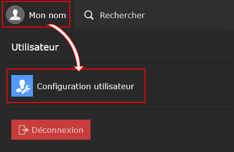 Pour accéder à vos paramètres utilisateur, cliquez sur votre nom dans le coin supérieur droit de l'interface d'administration. Cela déroule un volet contenant le bouton Configuration utilisateur. Cliquez dessus pour accéder à vos paramètres :