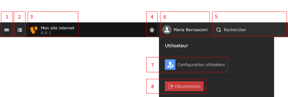 - Image de l’avatar et nom de l’utilisateur connecté. Cette zone est cliquable et permet de dérouler les options situées dessous (n°7 et 8).