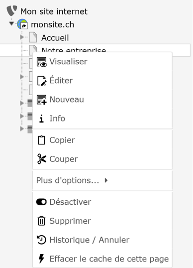 L’arborescence WEB est constituée de pages et de dossiers. Les dossiers dans cette arborescence se comportent comme des pages pour les actions listées ci-dessous. Les actions possibles sur ces éléments sont les suivantes :
